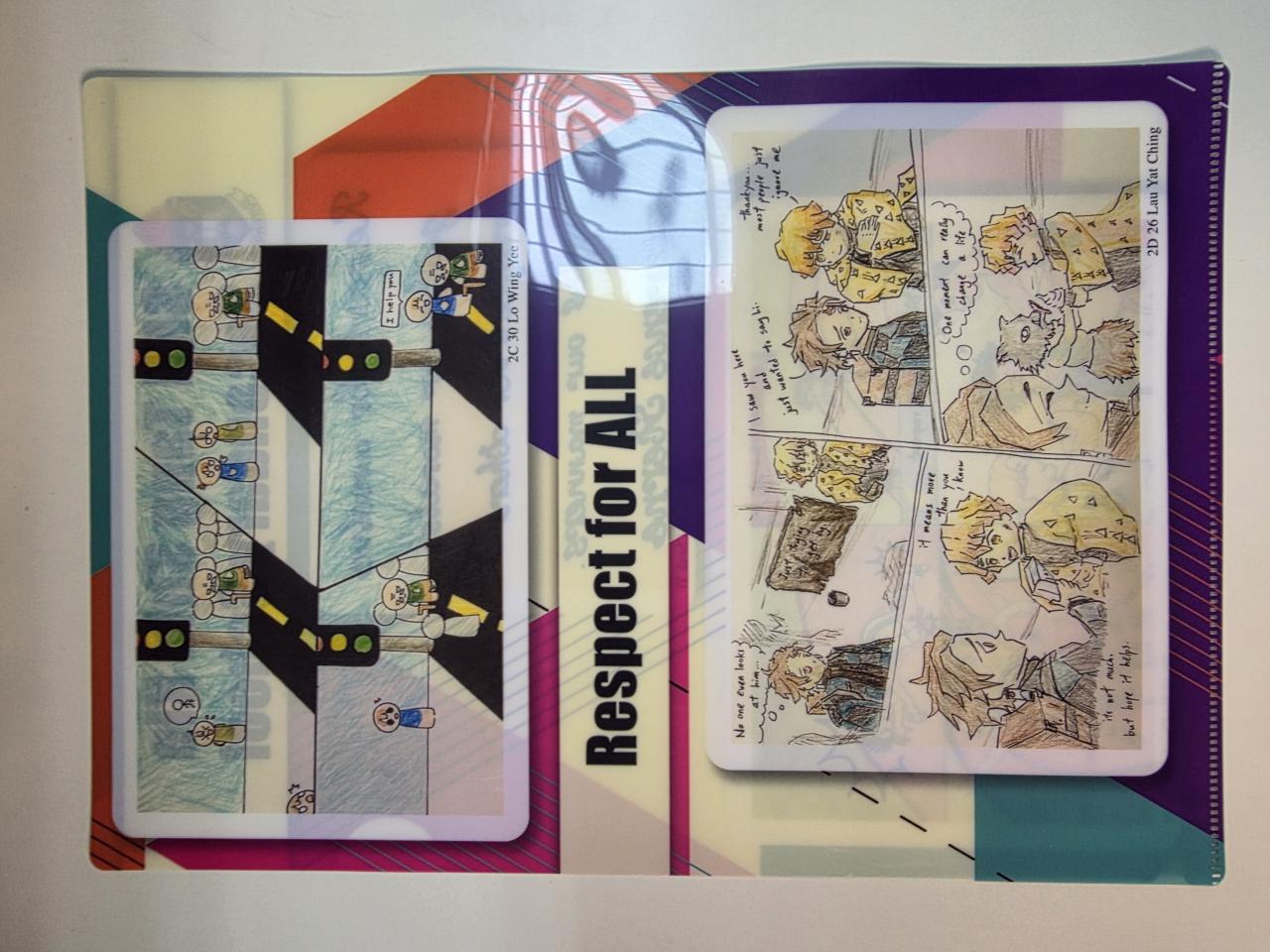 To further promote respect through creativity, the Moral, Civic and National Education Committee and the Visual Arts Department jointly organized a File Design Competition on the theme “Respect”. The winning designs, submitted by 2C Lo Wing Yee, 2D Lau Yat Ching, 2D Ng Cheuk Kiu Lucas, and 3D Ho Cheuk Yi, were printed on file folders distributed to all staff and students, symbolizing the spirit of respect in our school.